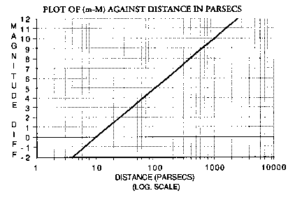 There are in fact two magnitude systems. One gives the brightness of a star as observed from here on Earth. This is the apparent magnitude . The other - absolute magnitude - gives a measure of the total amount of light being given out by the star in all directions. Both systems are logarithmic with a difference in magnitude of 5 being equivalent to a factor of 100 in brightness (NB small magnitudes correspond to bright stars). The absolute magnitude is directly related to the star's luminosity and the apparent magnitude can be measured here on Earth. From the Inverse Square Law , we can deduce an equation connecting the magnitudes and the star's distance. This allows us to calculate the distance in parsecs if we can find the star's apparent and absolute magnitudes (See graph).