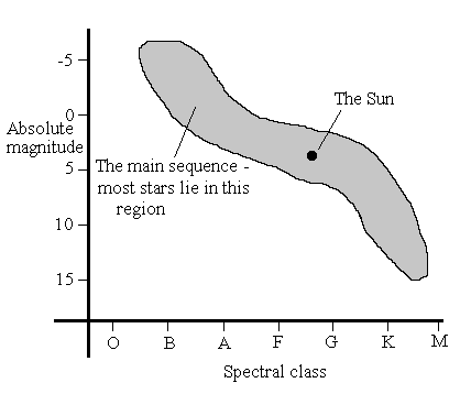 The way this method works is displayed well by plotting absolute magnitude of stars against their spectral type . This graph (above), known as a Hertzsprung-Russell diagram shows that most stars lie on a straight line - the main sequence .