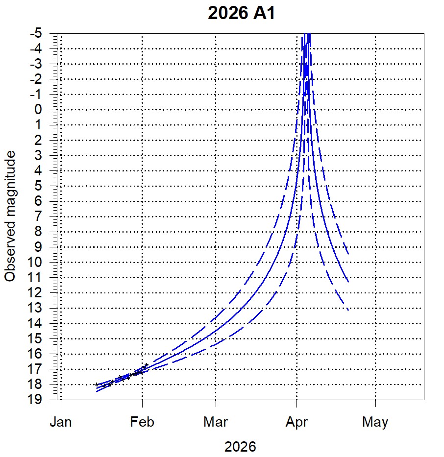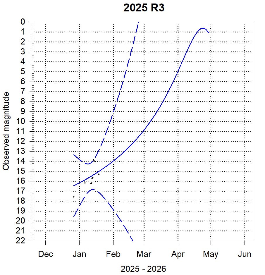 Light curves of comets that may become brighter than 9th magnitude [click on thumbnail to get the full scale image, updated on 2026 February 4]. The dotted lines represent 99% confidence limits. The fitted curves are for an aperture of 30 cm, so the comet will appear brighter to visual observers using a smaller aperture. 2024 E1, 2025 R3, 2026 A1